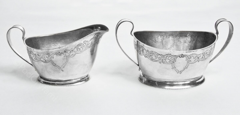 Remarks: Creamer: from 1929, Weight 102 g, Length 10.5 cm, Width 7 cm, Height 6.5 cm, Sugar bowl: from 1929, Weight 135 g, Length 10.5 cm, Width 8 cm, Height 7.5 cm,