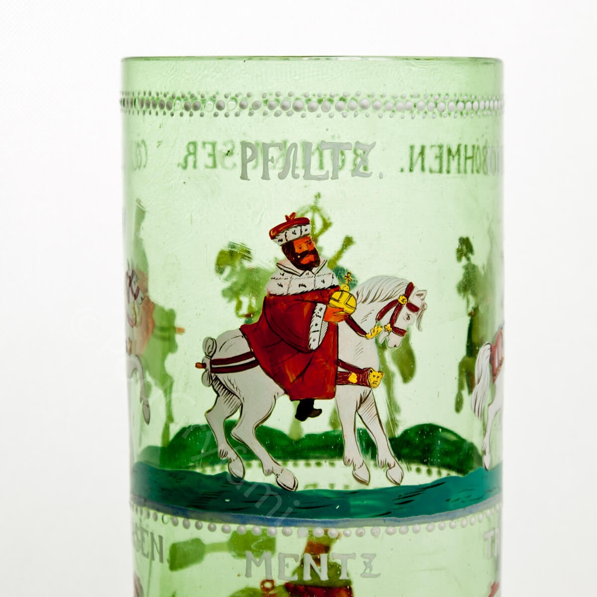 Szklanica typu „Kurfürstenhumpen”, Niemcy lub Czechy, 1 ćw. XX wieku (po 1900), wytwórnia nieznana. Materiał i technika: szkło przejrzyste, barwione w masie na zielono (w masie liczne pęcherzyki powietrza), malowane barwnymi emaliami szkliwnymi. Szklanica walcowata z płaskim dnem, nakryta półkoliście sklepioną pokrywą z wieloczłonowym, tralkowym uchwytem zakończonym gałką. Na płaszczu naczynia dekoracja malowana emaliami szkliwnymi przedstawia postacie jeźdźców rozmieszczone w dwóch strefach. Postacie są odziane w płaszcze z gronostajowymi kołnierzami i dzierżą w dłoniach berła. Dwie postacie niszą na głowach koronę, pozostali – mitry książęce. Każda z postaci jest opatrzona podpisem, umieszczonym powyżej: „König V. Böhmen / Rom. Kaiser / Coln / Sachsen / Pfalz / Brandenburg / Trier / Metz”. Powyżej bordiura złożona z małych, białych kropek, namalowanych w mechanicznie wyżłobionych zagłębieniach.