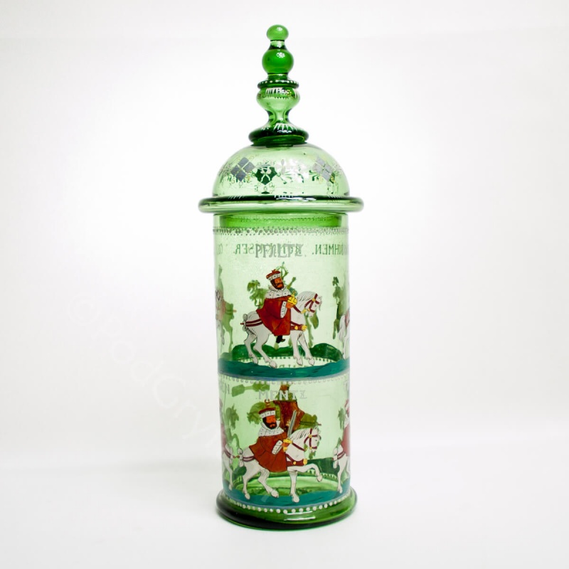 A "Kurfürstenhumpen" glass, from Germany or Bohemia, fin de siécle (after 1900), from an unknown manufacturer. Content and technique: clear glass, dyed green en masse (several air bubbles result from this method), painted with glass enamels. A cylindrical glass goblet with a flat bottom, and a domed cover with an attached multifaceted handle. On the outside of the piece, painted cut enamel decorations show men on horseback riding around on two levels. These characters are dressed in mink coats and wielding scepters in their hands. Two of the men are wearing crowns, the rest royal miters. Each of the characters has their title listed above: "König V. Böhmen / Rom. Kaiser / Coln / Sachsen / Pfalz / Brandenburg / Trier / Metz." At the top of the goblet is a border mader up of small white dots, made by machine cut into the glass.