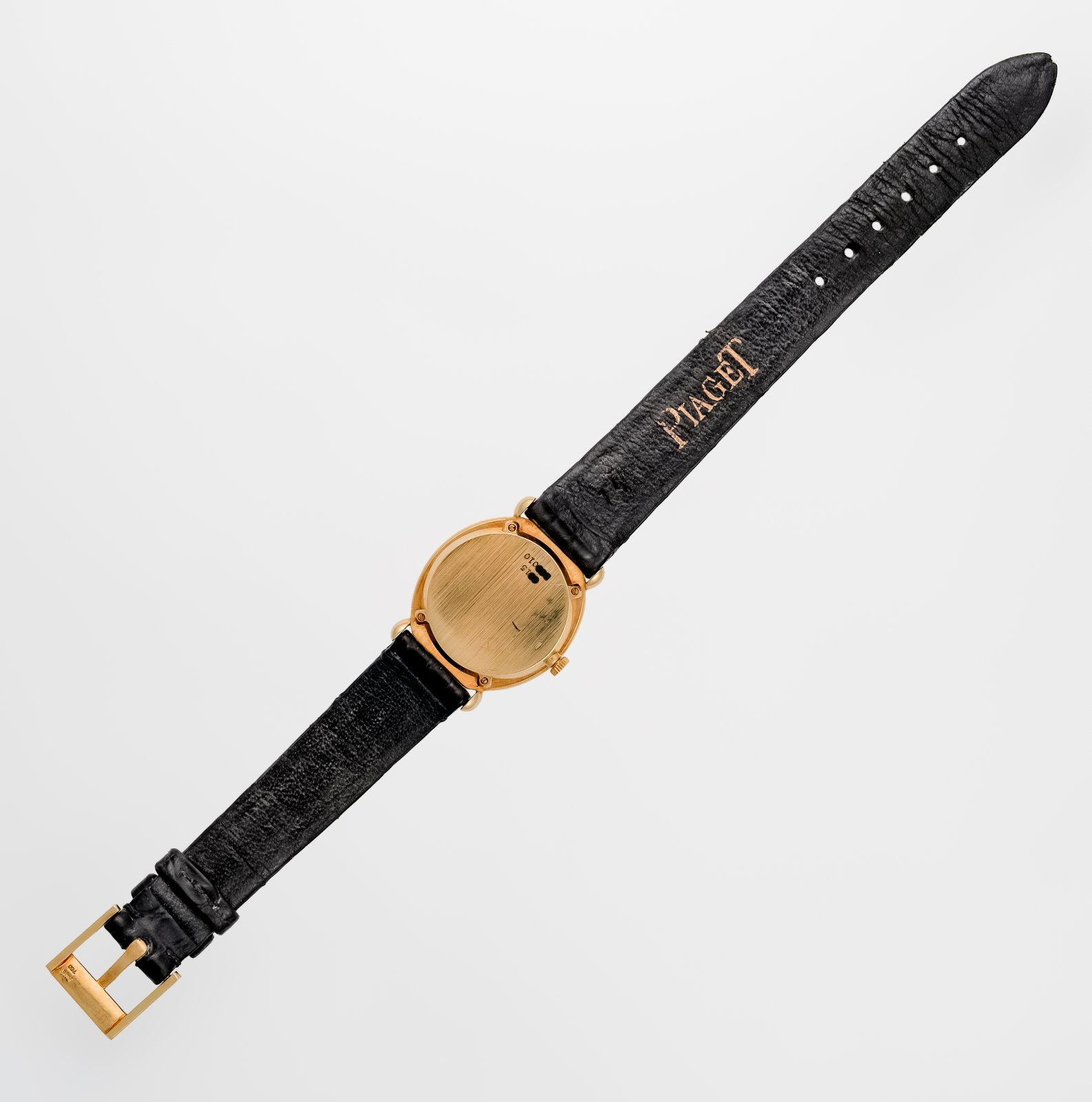 Owalny, damski, mechaniczny zegarek wykonany w złocie wysadzany diamentami. Sygnowany przez znaną markę Piaget będącą synonimem elegancji i luksusu.