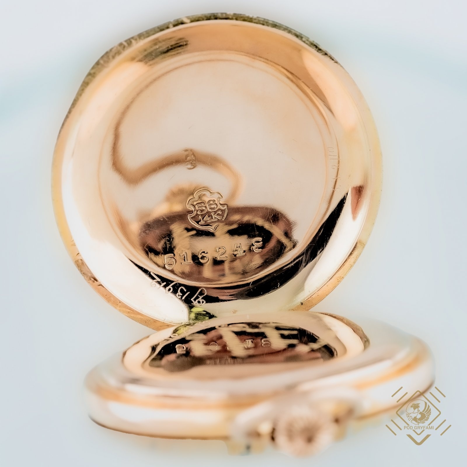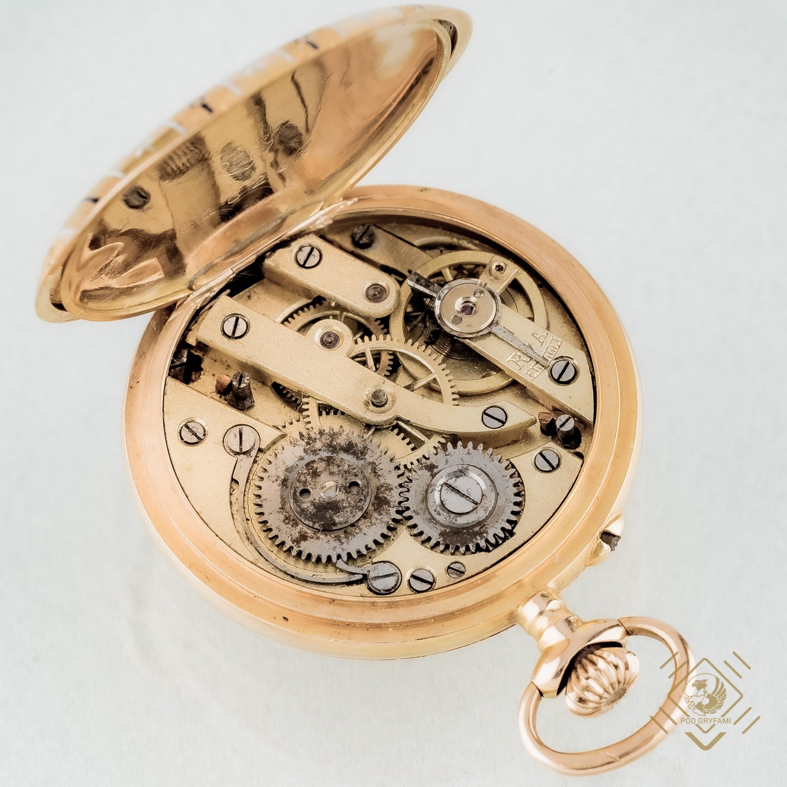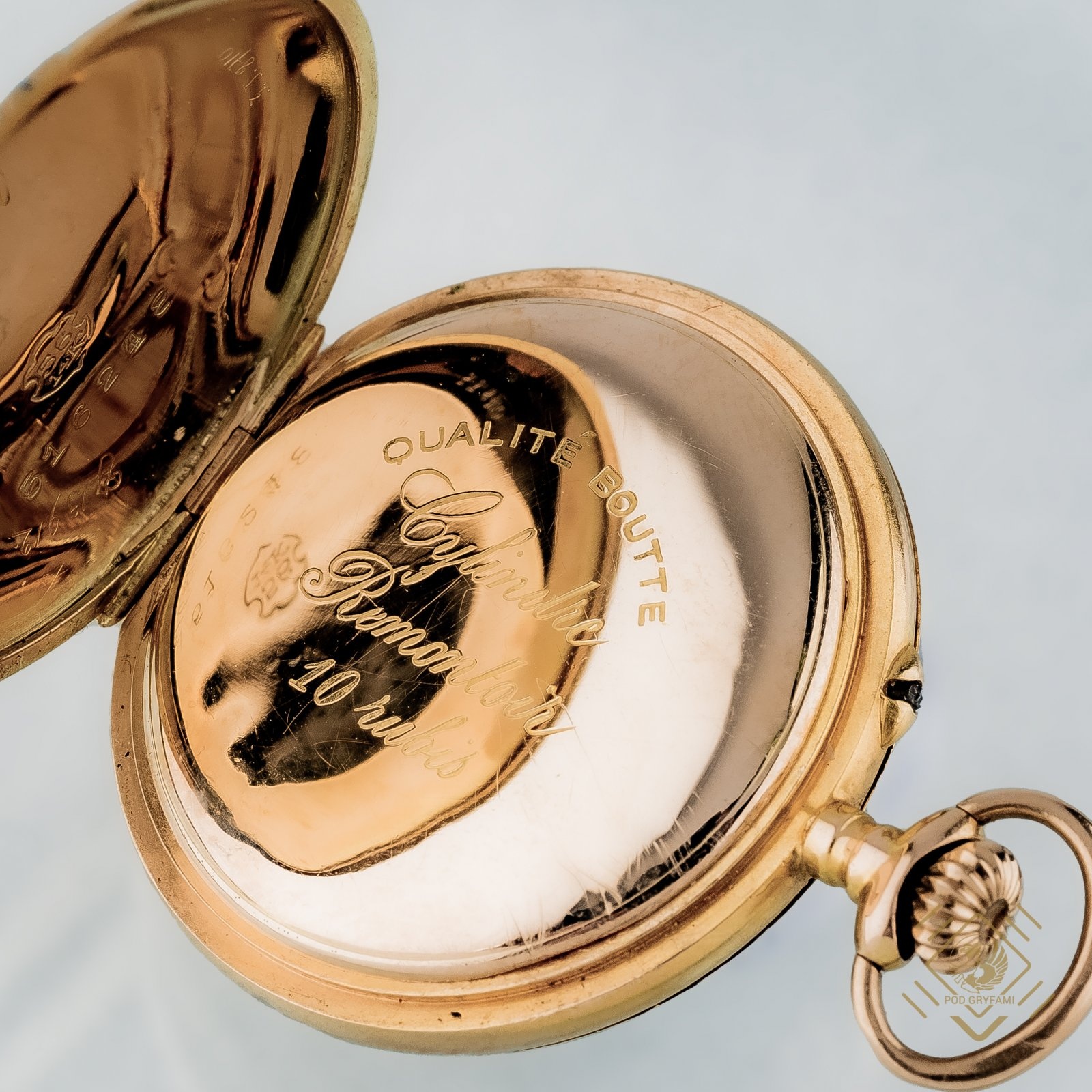 Damski, trzykopertowy zegarek kieszonkowy. Zewnętrzne koperty grawerowane i ozdobione czarnymi oraz białymi emaliami. Na tarczy lekko zatarta sygnatura marki Boutte. Zegarek wykonany z 14 karatowego złota na przełomie XIX i XX wieku z przeznaczeniem na rynek rosyjski.