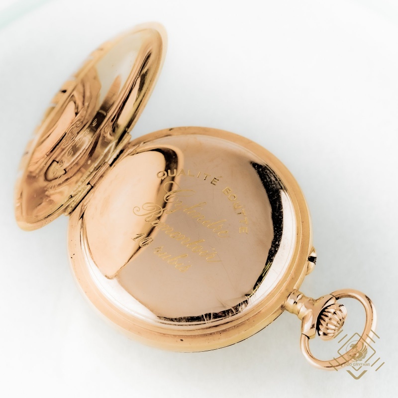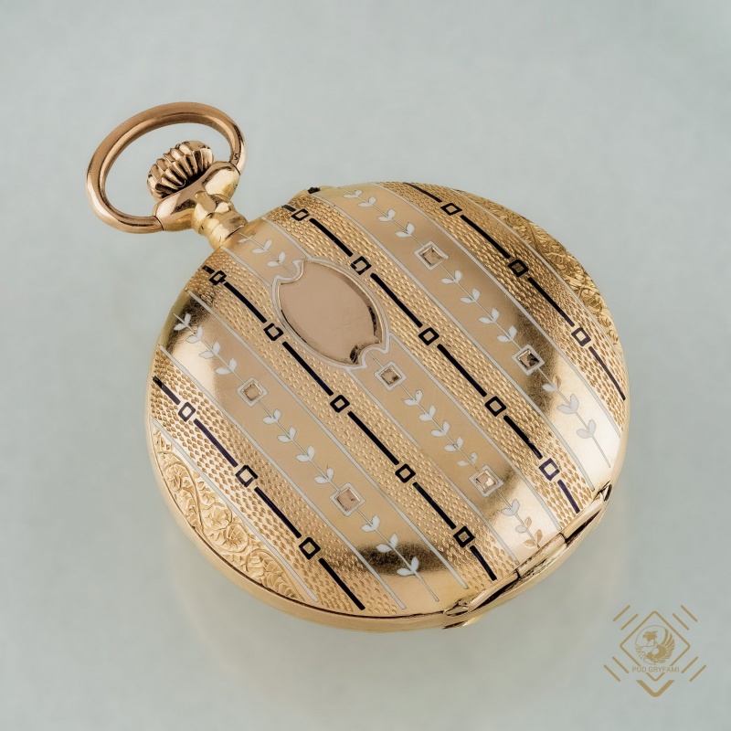 A ladies' three-case pocket watch. The outer casing is engraved and decorated with black and white enamels. On the dial a slightly washed out Boutte brand hallmark. The watch was made of 14 karat gold at the turn of the 19th and 20th centuries for the Russian market.