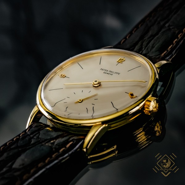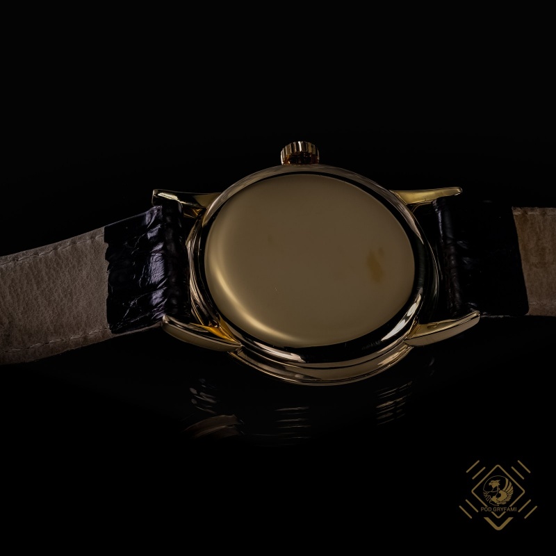 One of the most elegant classic Patek Philipp watches. Made in the 1950s (around 1954) in 18 carat gold. Face in the color of eggshell white with simple golden tips. In the lower part of the dial there is a small second hand dial. The model has a Swiss mechanical mechanism. Brand appears on the face: Patek Philippe Geneve.
