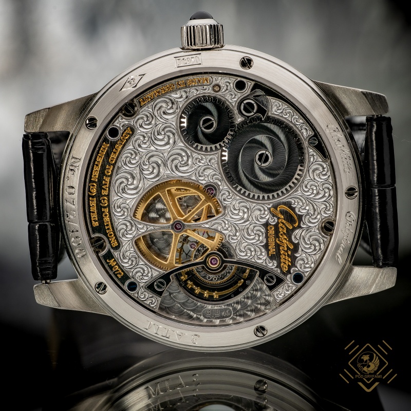 Platinum watch from the Regulator Turbillon collection with a leather band and engraved platinum clasp. This was a limited collection, only 100 pieces were manufactured – this is number 72. The model has an elegant case with a set of certificates, magnifying glass and key. This piece is highly recommended for collectors, people who appreciate beauty and precision, and of course business leaders.