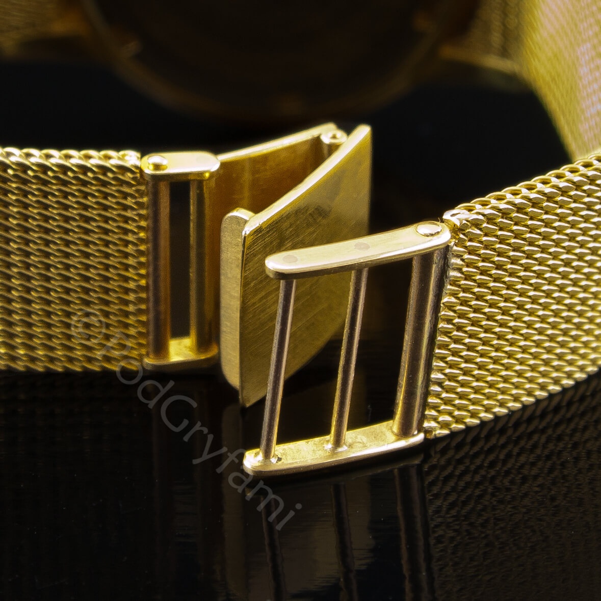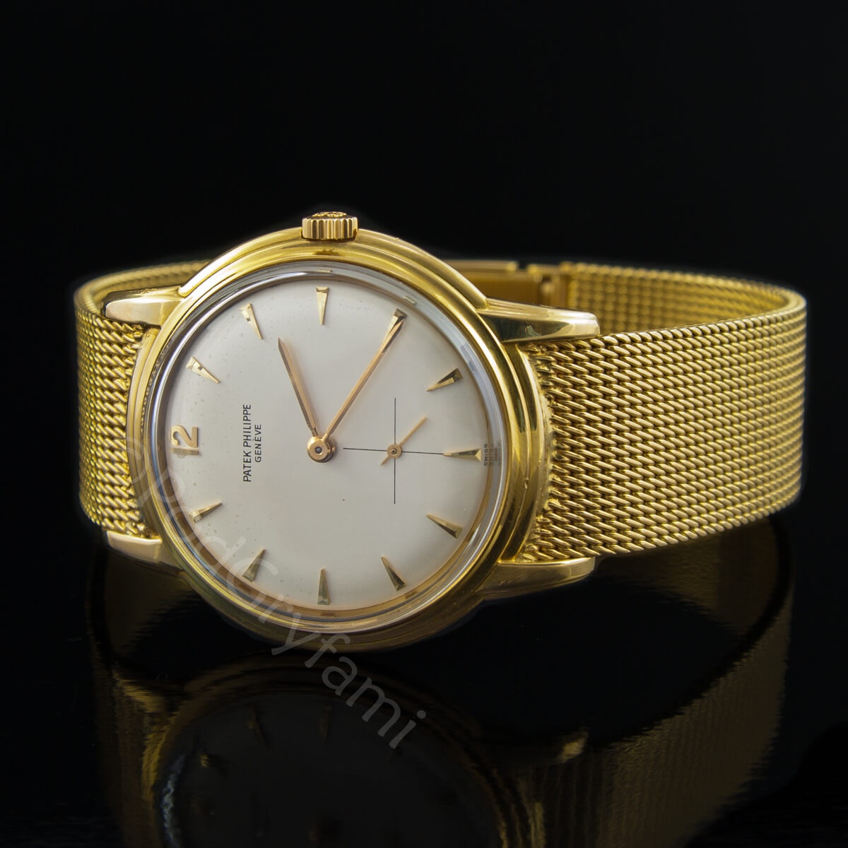 Klasyczny, naręczny zegarek męski, wyprodukowany w latach 50 – tych XX w. (ok. 1958) Do jego wykonania wykorzystano 18 karatowe złoto. Pleciona bransoleta, typowe wskazówki oraz złote indeksy godzinowe, idealnie współgrają ze srebrną tarczą, na której został umieszczony sekundnik.Model posiada naciąg szwajcarski mechaniczny.Sygnatura Patek Philippe Geneve umieszczona na cyferblacie.