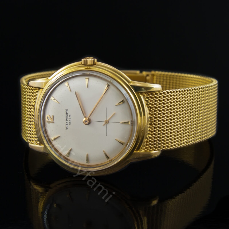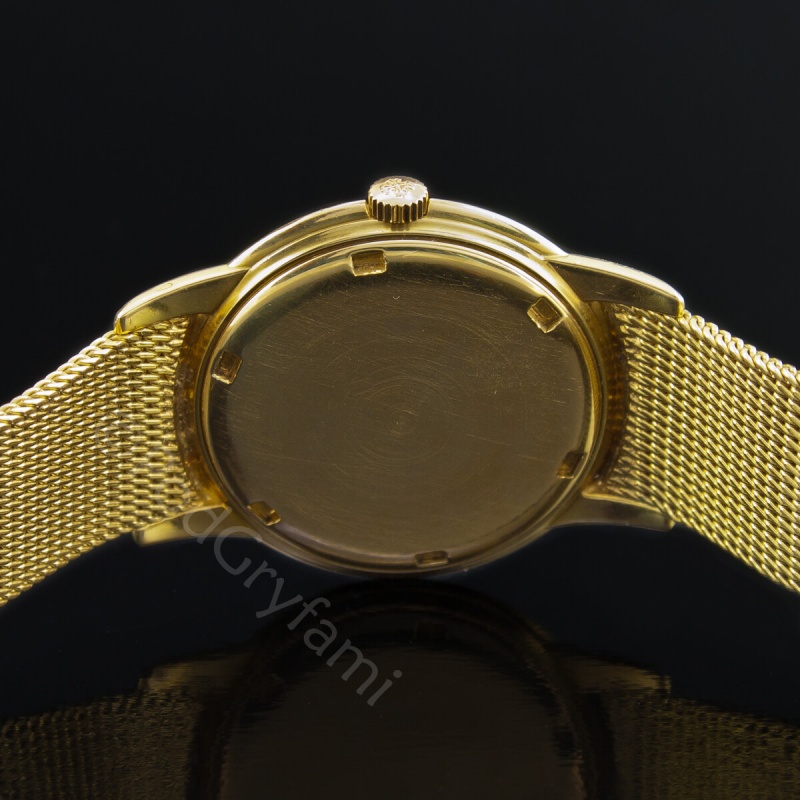 A classic wristwatch for men, made in the 1930s and 1950s. (ca. 1958) 18 carat gold was used to make it. Chainmail bracelet, typical hands and golden batons perfectly match the silver dial on which the seconds hand is placed. The model is equipped with Swiss mechanical movement.
