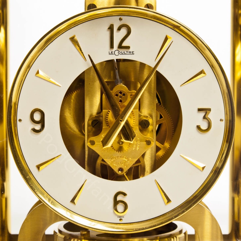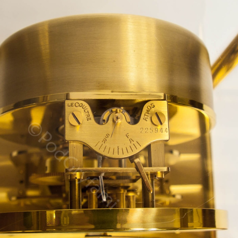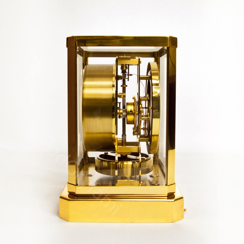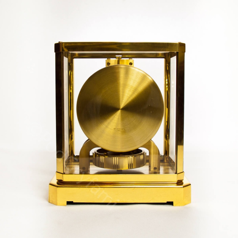 Jaeger LeCoultre office clock from the Atmos collection. The present model was produced in Switzerland between 1960 and 1980. It is made of brass. Equipped with a mechanism with automatic temperature movement, based on the expanding gas inside the sealed capsule. Energy is drawn even from the smallest changes in temperature and atmospheric pressure. The brand engraving is placed on the rear part of the mechanism. Model: Caliber 528-8